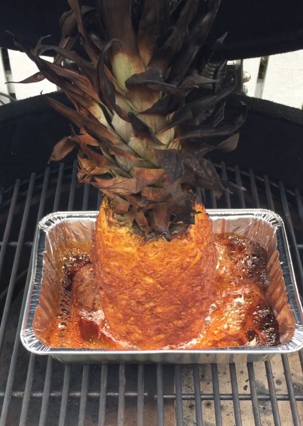 Sett deretter ananasen på grillen på en varmesikker skål eller i en bakke av noe slag. Om du har en saus som har rent av ananasen etter at du tok sukkeret på, kan du tømme denne rundt kantene på ananasen eller oppi skålen/bakken sammen med ananasen.