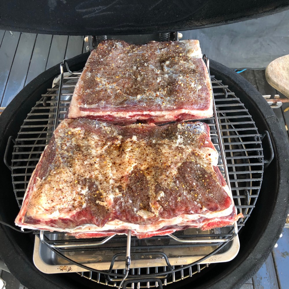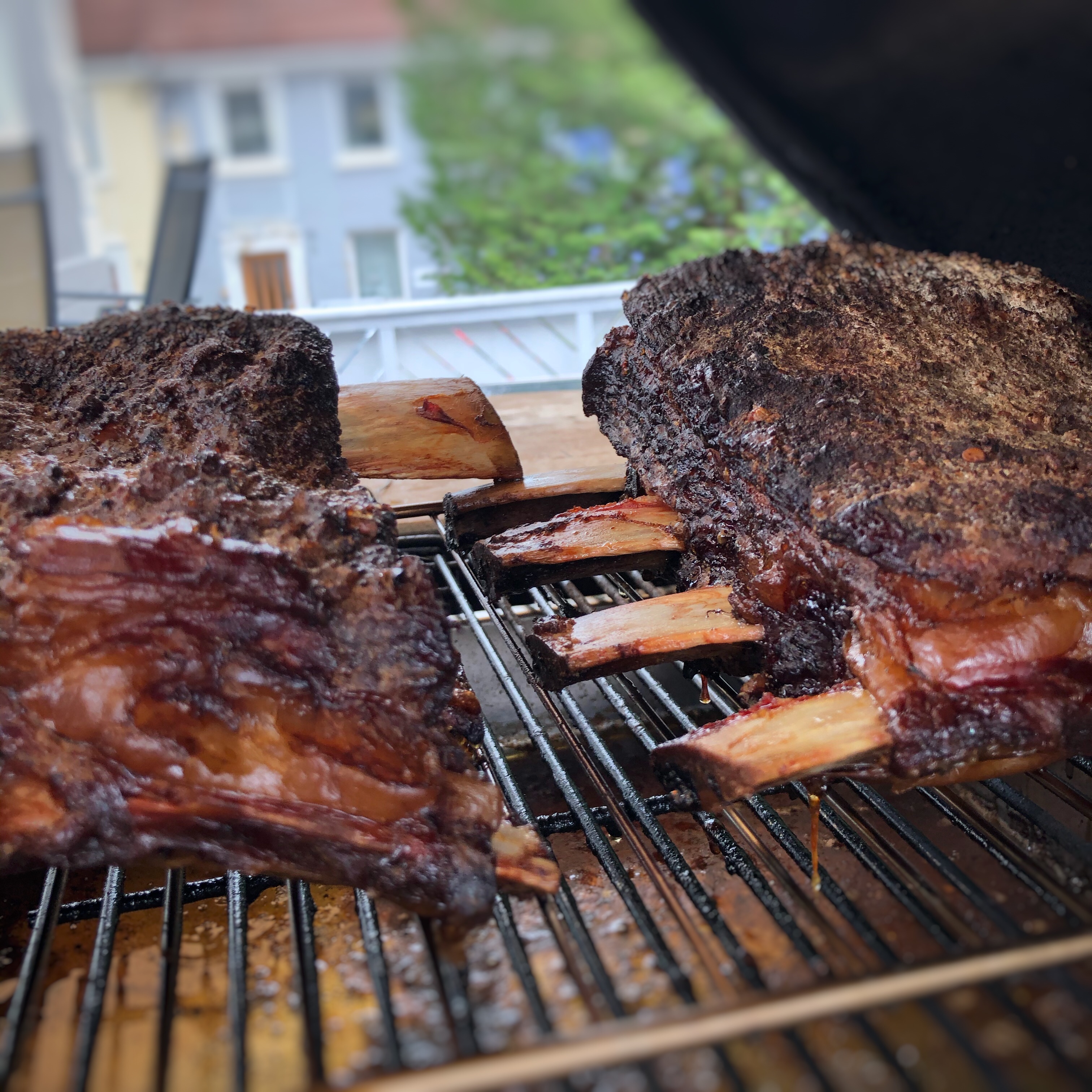 Dette kjøttet er i svært seigt på grunn av mye bindevev mellom muskelfibrene og ribbeina. Dette må varmebehandles over lang tid for å bli mørt. I en gryte som koker vil det normalt ta 2-2,5 timer, mens i en trykkoker 45 minutter. Men vi skal ha dette på grillen. Da er beste metode å legge kjøttet på indirekte side og bruke lav varme (gjerne 120 grader) over lang tid. Disse stykkene tok 7,5 timer å bli ferdige, da var kjernetemperaturen 96 grader Celsius! Om du synes dette var høyt, så sammenligner du gjerne med en mør biff som er medium minus på ca 57 °C Men det må altså til. Det blir ikke tørt fordi bindevevet (kollegenet) omdannes til flytende gelatin sent i prosessen. Dette, sammen med et generøst fettinnslag, gjør opplevelsen saftig! Men regn med å bruke alt fra 5 til 10 timer, det avhenger av mange variabler som tykkelsen på stykket, grilltemperatur mm.
