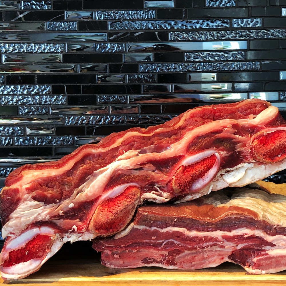 Men over til forberedelsene: Kontakt en god slakter eller kjøttskjærer, eller snakk med den ansvarlige for kjøttdisken hos en velassortert butikk. Be om en bibringe, som stykket heter på norsk, som er et helt stykke i den vekten du ønsker. Ofte må dette bestilles en uke i forveien. Disse stykkene som du ser øverst er tilsammen 5 kilo, og jeg fikk dem i ett stykke og saget selv over på tvers av ribbene slik at de ble mer håndterlige og passer på en stor tallerken når de er ferdig og serveringsklare. Du kan fint be om et på 2-3 kilo også, hvis du bare skal ha til familien på 4-5. Det er en del avskjær, fett og bein som ikke kan spises. Vårt 5 kilos stykke rakk til 3 middager for to voksne, en 12 åring og en på 18 måneder – ja, han digger god barbecue han også og er som sin far en skikkelig karnivor!