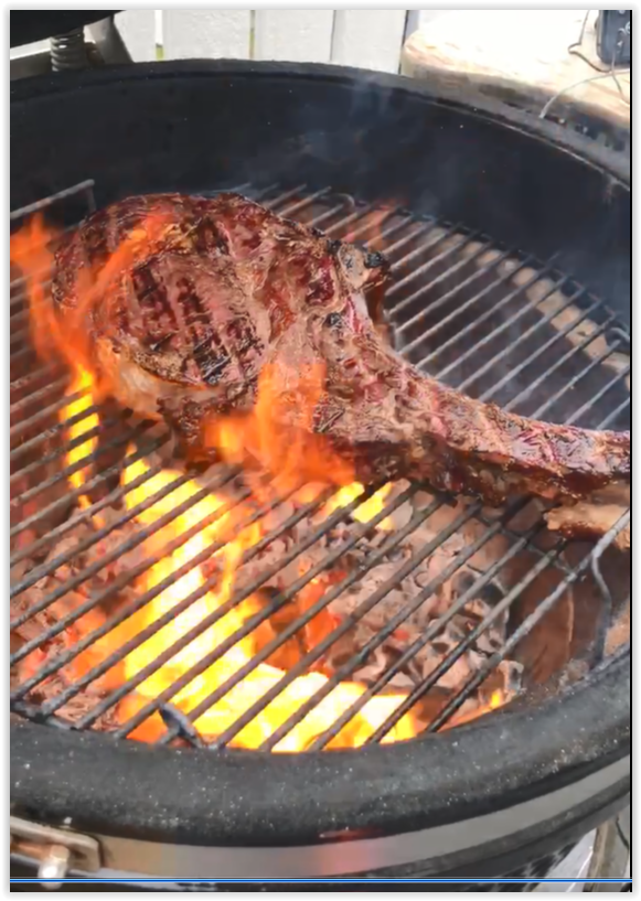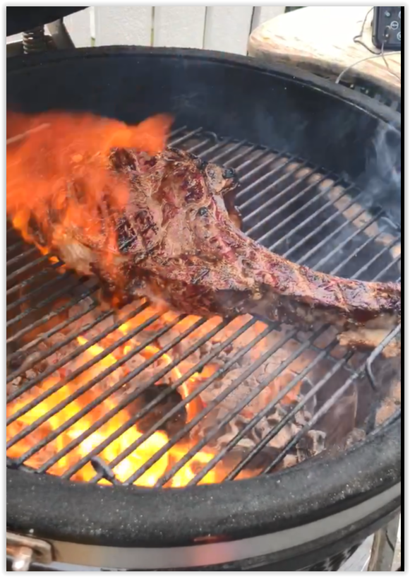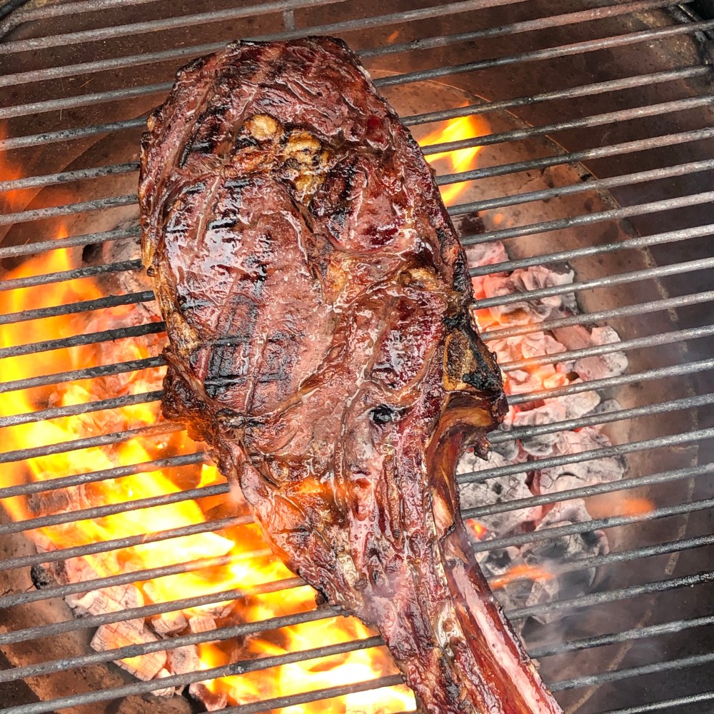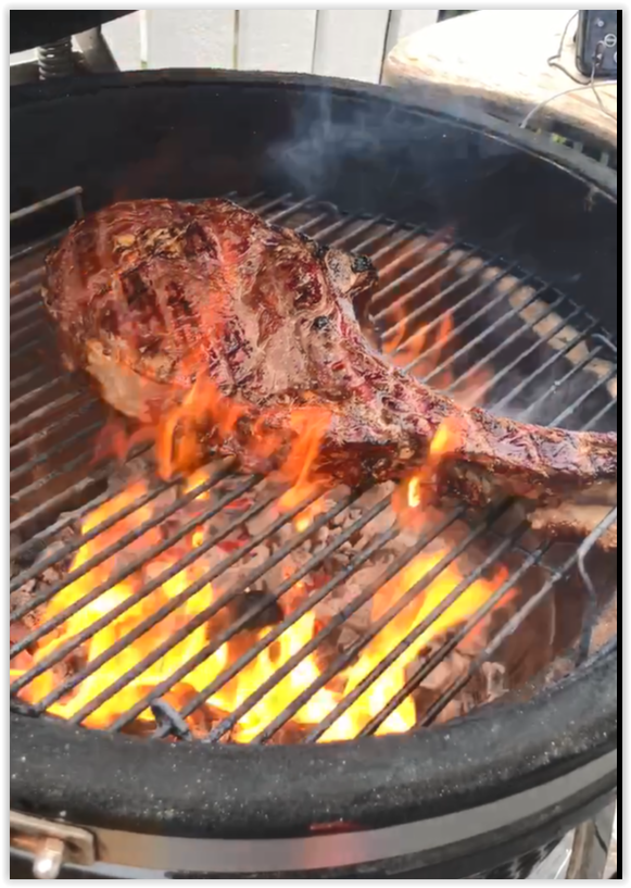 - Legg tomahawken over direkte varme og følg med (bruk gjerne temeraturproben nå også). Er temperaturen høy nok vil bruningen skje ganske fort, så snu gjerne hyppig, spesielt hvis det er åpne flammer. Du vil at kjøttproteinet skal brunes, ikke karboniseres!