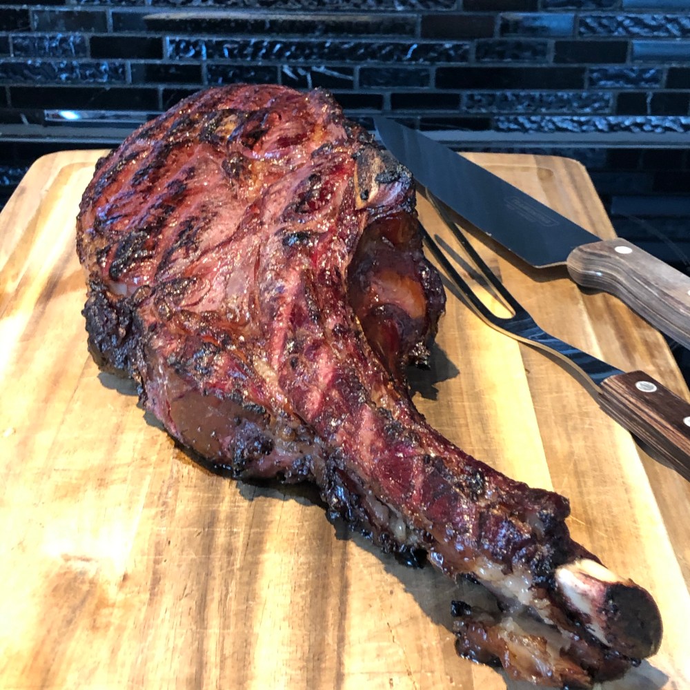 - Server kjøttet umiddelbart/raskt når du er fornøyd med fargen. Å hvile kjøttet nå gi liten mening da det allerede har hvilt, og i tillegg kan du risikere at de sprø-grillede delene blir bløte og kjedelige. Hugg inn og nyt mesterstykket ditt – dette har du fortjent! Skjær bort beinet og server centimetertykke stykker til familien eller til gjestene. Denne tomahawken vil huskes lenge i denne familien! Lykke til med din!
