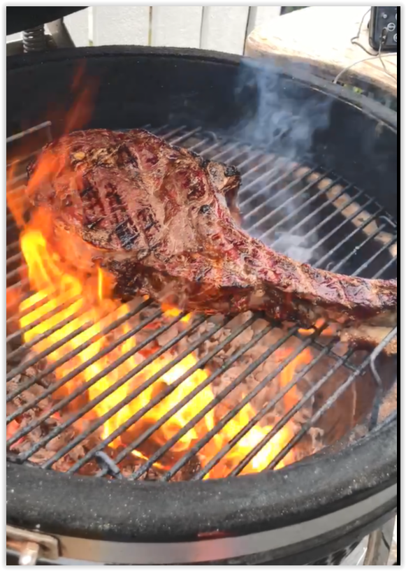 - Legg tomahawken på indirekte varme og sett inn en temperaturprobe og følg med på kjernetemperaturen. Om du tar den rett fra kjøleskapet eller om den er “romtemperert” betyr lite, men tiden det tar for å nå ønsket kjernetemperatur tar litegrann lenger tid. Men du unngår risikoen ved bakterievekst i kjøttets overflate i romtemperatur!