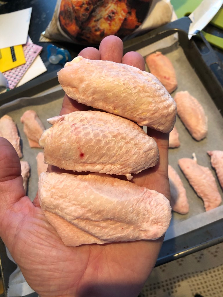 Første bud er å kjøpe store og gode kyllingvinger. Rå selvfølgelig! Vi styrer unne de triste vi finner i varmdisken som har ligget altfor lenge i varmen og blitt slappe!