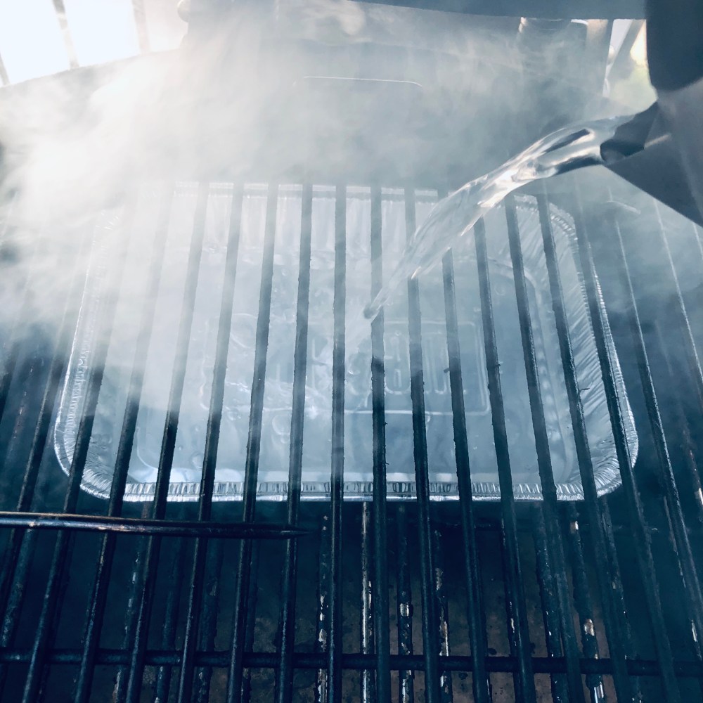 Vannbad! Dette hjelper på å holde jevn temperatur og at den ikke stiger ukontrollert. Og ikke minst bidrar dampen å holde fuktigheten høy slik at kjøttet ikke tørker for mye ut. Her bruker jeg en Weber grillbakke hvor jeg har kokende vann fra enn vannkoker. Legges under eller mellom varmekilden og kjøttet.
