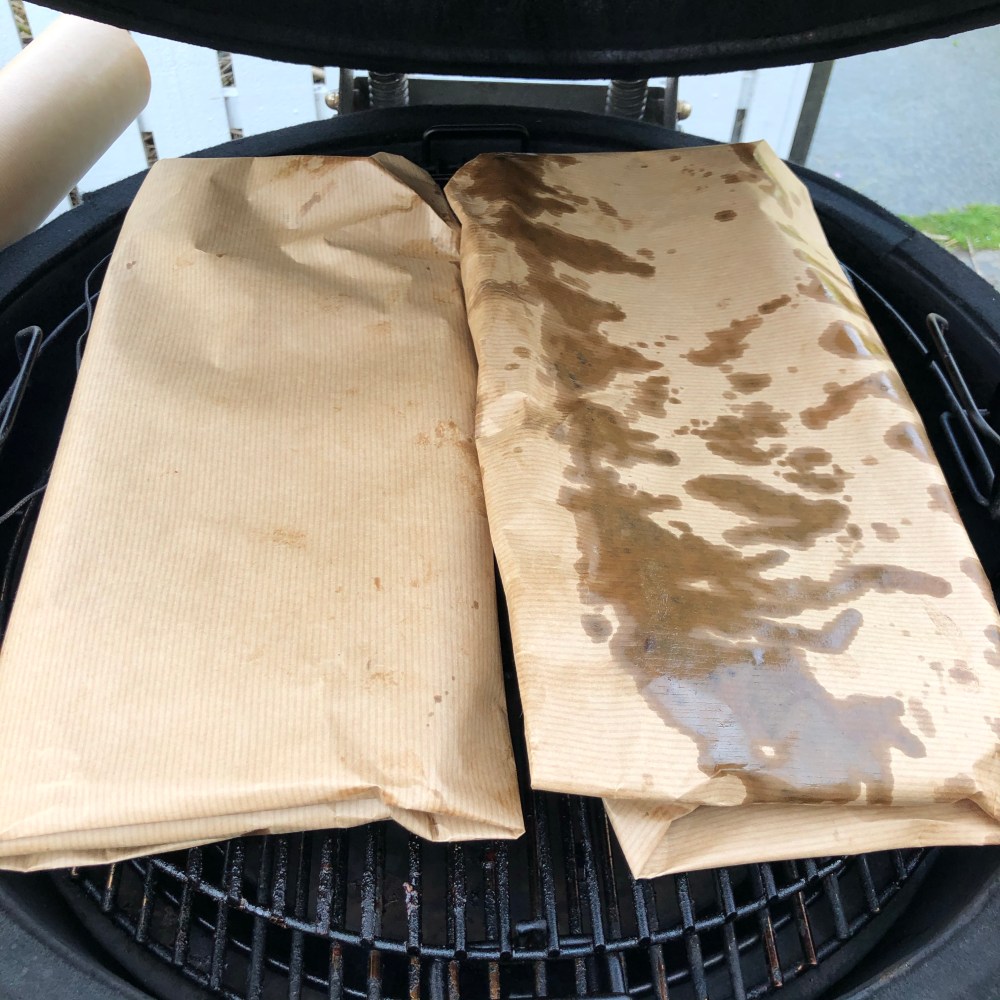 La dem ligge i ca 3 timer. Da har de fått god farge fra varme, røyk og rubben. Spray på med en blanding av vann og eplecidereddik eller eplejuice. Jeg pakker inn i alu-folie eller kraftpapir etter rundt 3 timer. Synes du de blir for mørke tidligere, så pakker du dem inn tidligere. Dette hjelper å beholde fuktigheten i kjøttet, slik at sluttresultatet blir saftig om mørt.